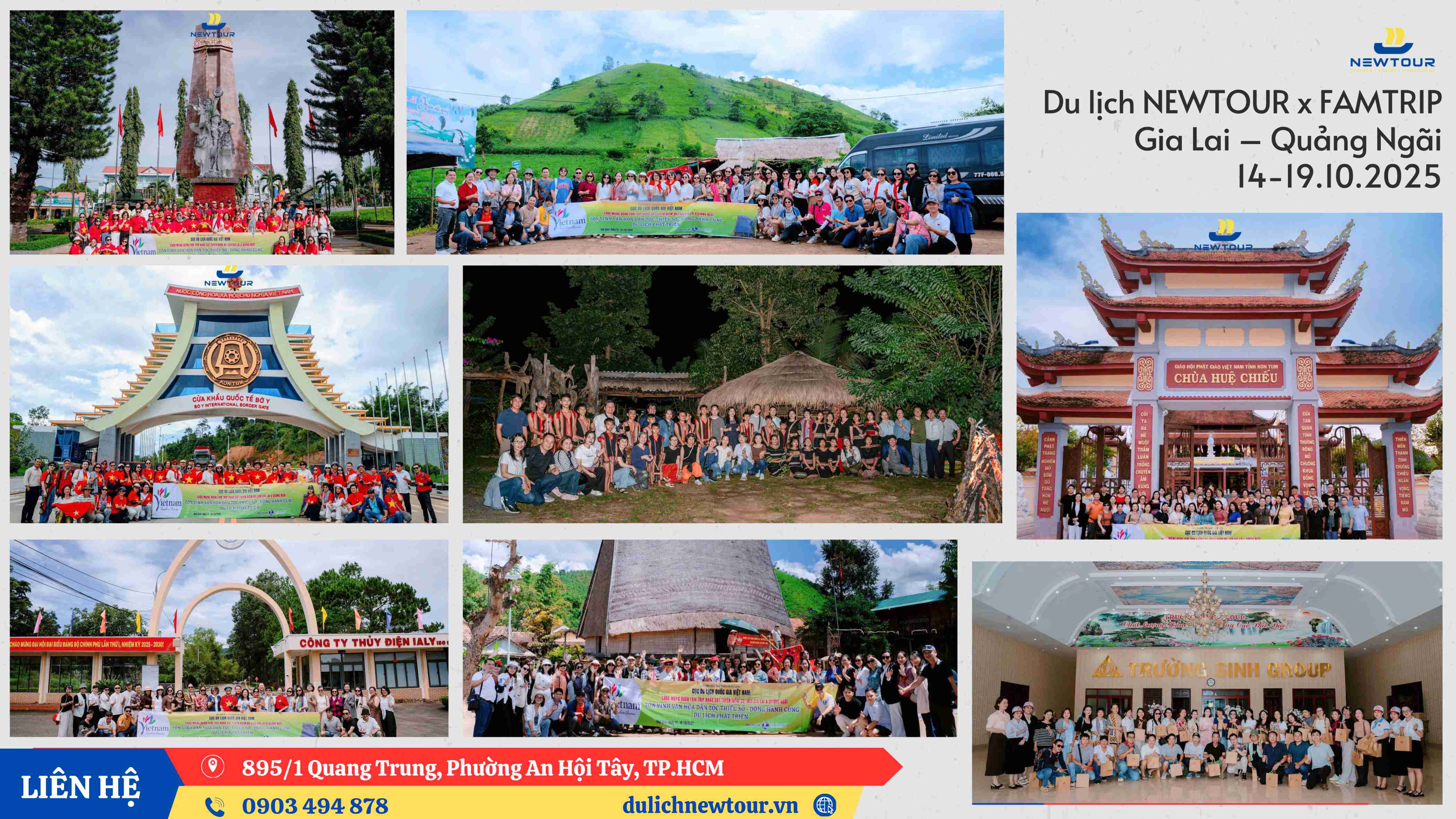 Từ ngày 14 – 19/10/2025, NEWTOUR vinh dự tham gia chuyến Famtrip Gia Lai – Quảng Ngãi 2025 cùng gần 60 doanh nghiệp du lịch trên toàn quốc, do Cục Du lịch Quốc gia Việt Nam tổ chức. Đây là hành trình kết nối – trải nghiệm – sáng tạo, góp phần thúc đẩy phát triển du lịch bền vững và quảng bá hình ảnh Việt Nam thân thiện, giàu bản sắc.