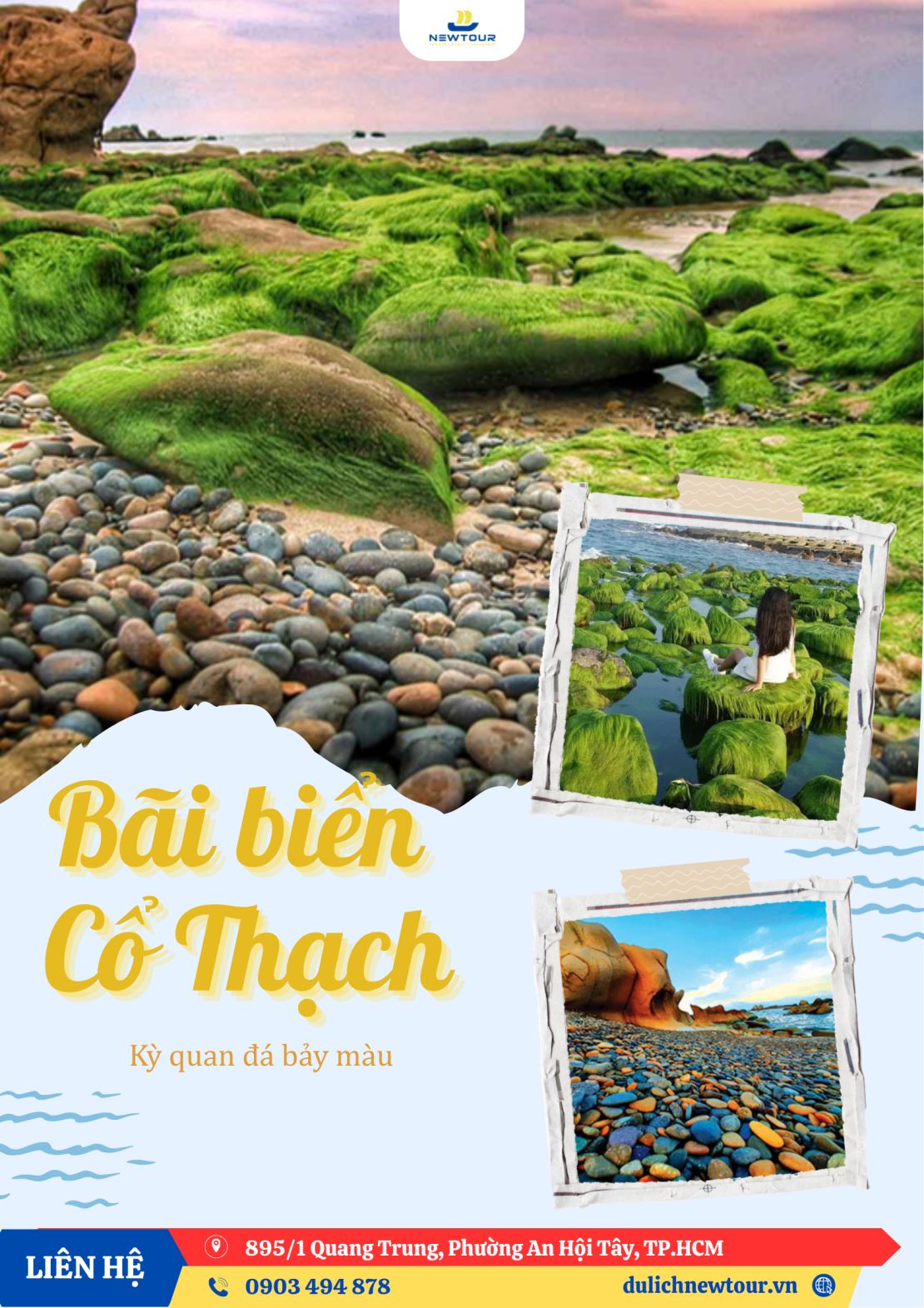 Biển Cổ Thạch thuộc huyện Tuy Phong, nổi tiếng với bãi đá bảy màu trải dài độc đáo, đặc biệt rực rỡ nhất vào tháng 3 – 4 khi rêu xanh phủ lên đá.