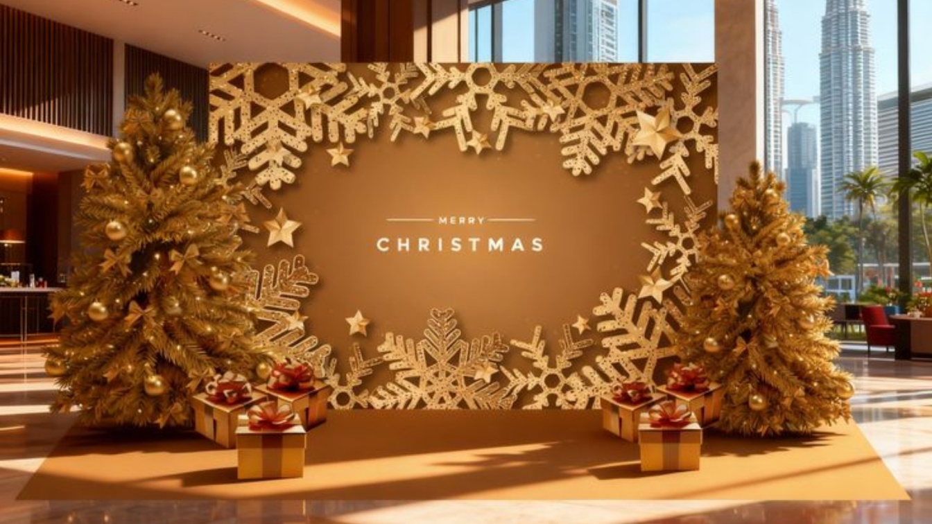 4. Mẫu backdrop Gala Dinner cuối năm ấm cúng với chủ đề Tết/Giáng sinh